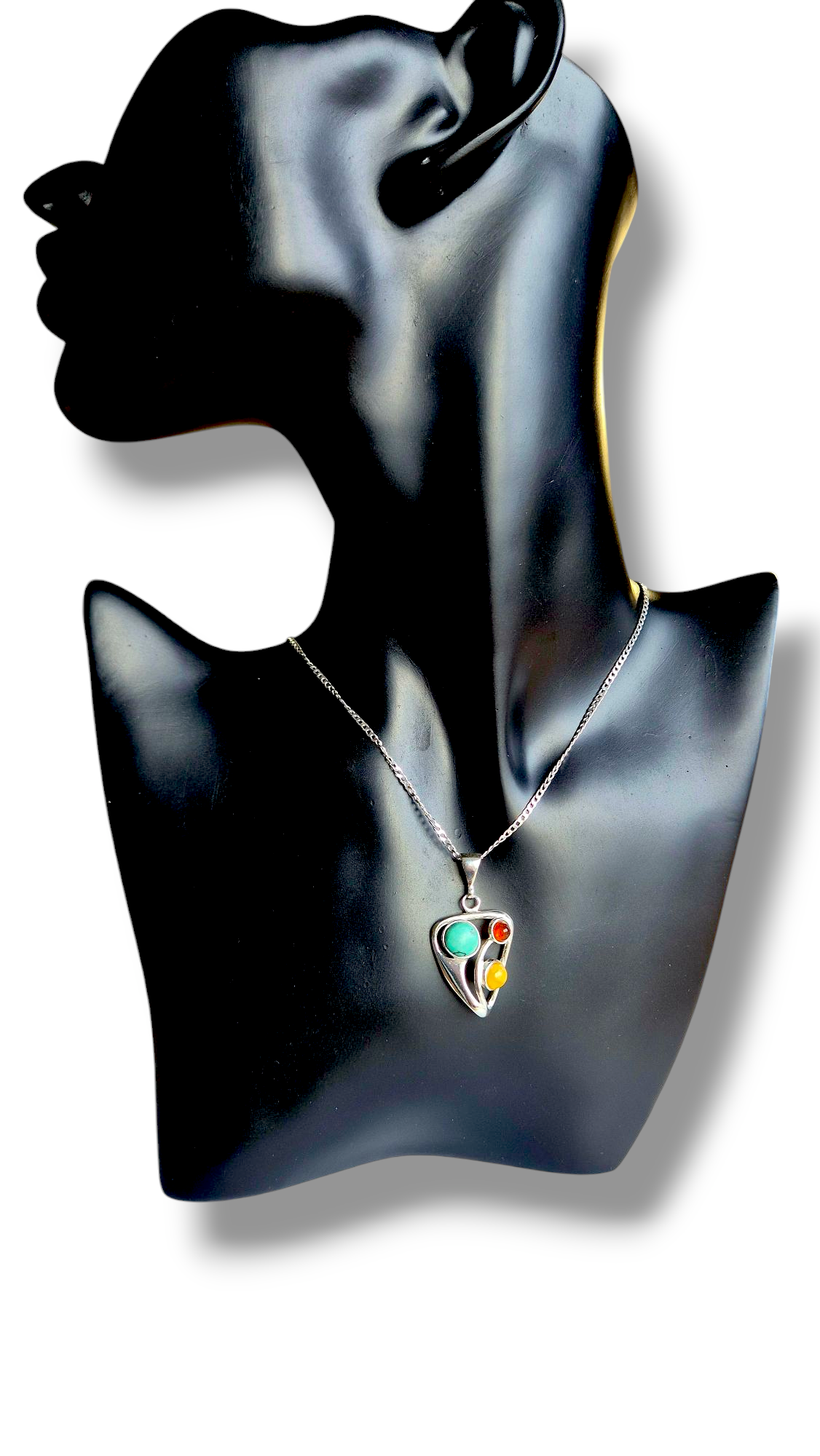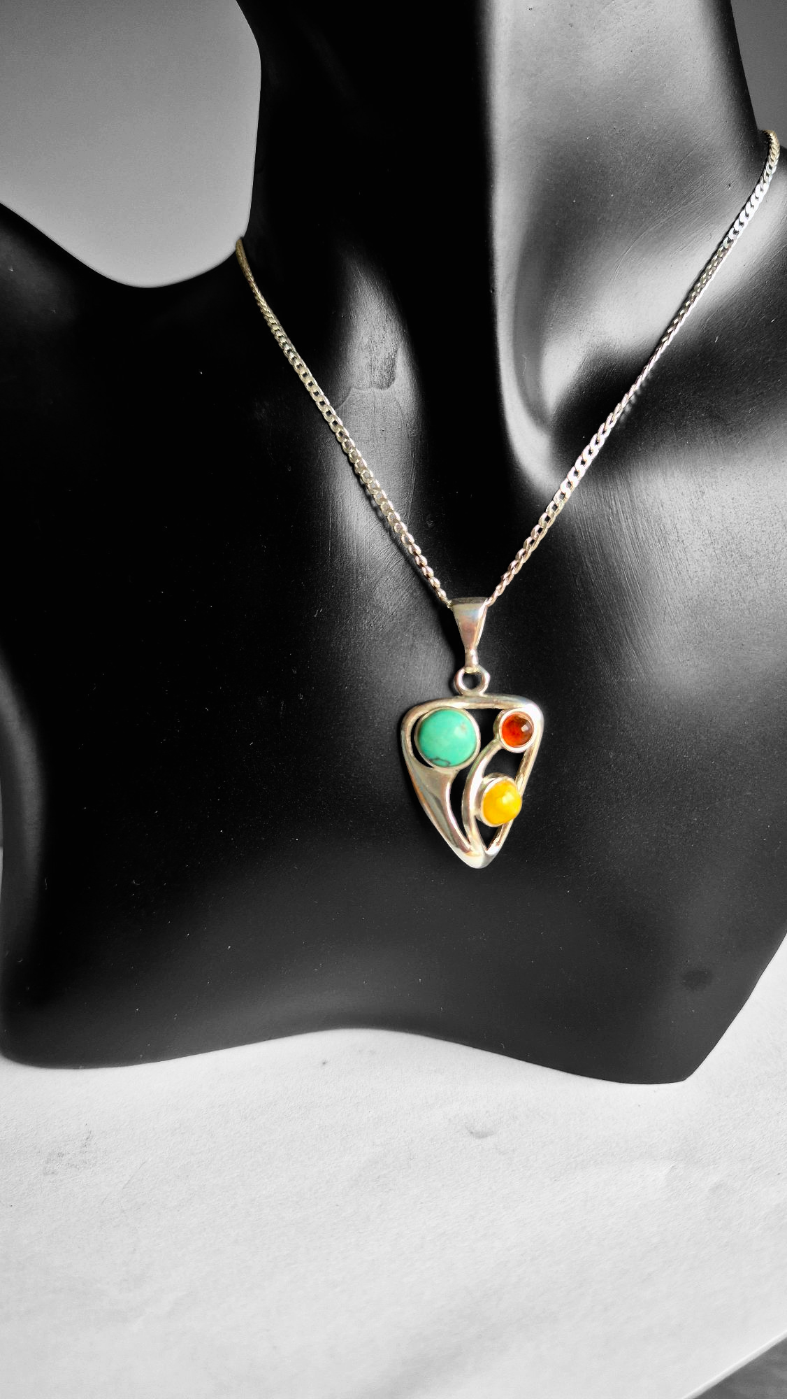 Embrace elegance and meaning with this beautifully handcrafted sterling silver pendant, featuring a stunning trio of natural gemstones. Designed to symbolize balance and energy, this unique piece blends the calming essence of turquoise with the warmth of Baltic amber in a contemporary, artistic setting.