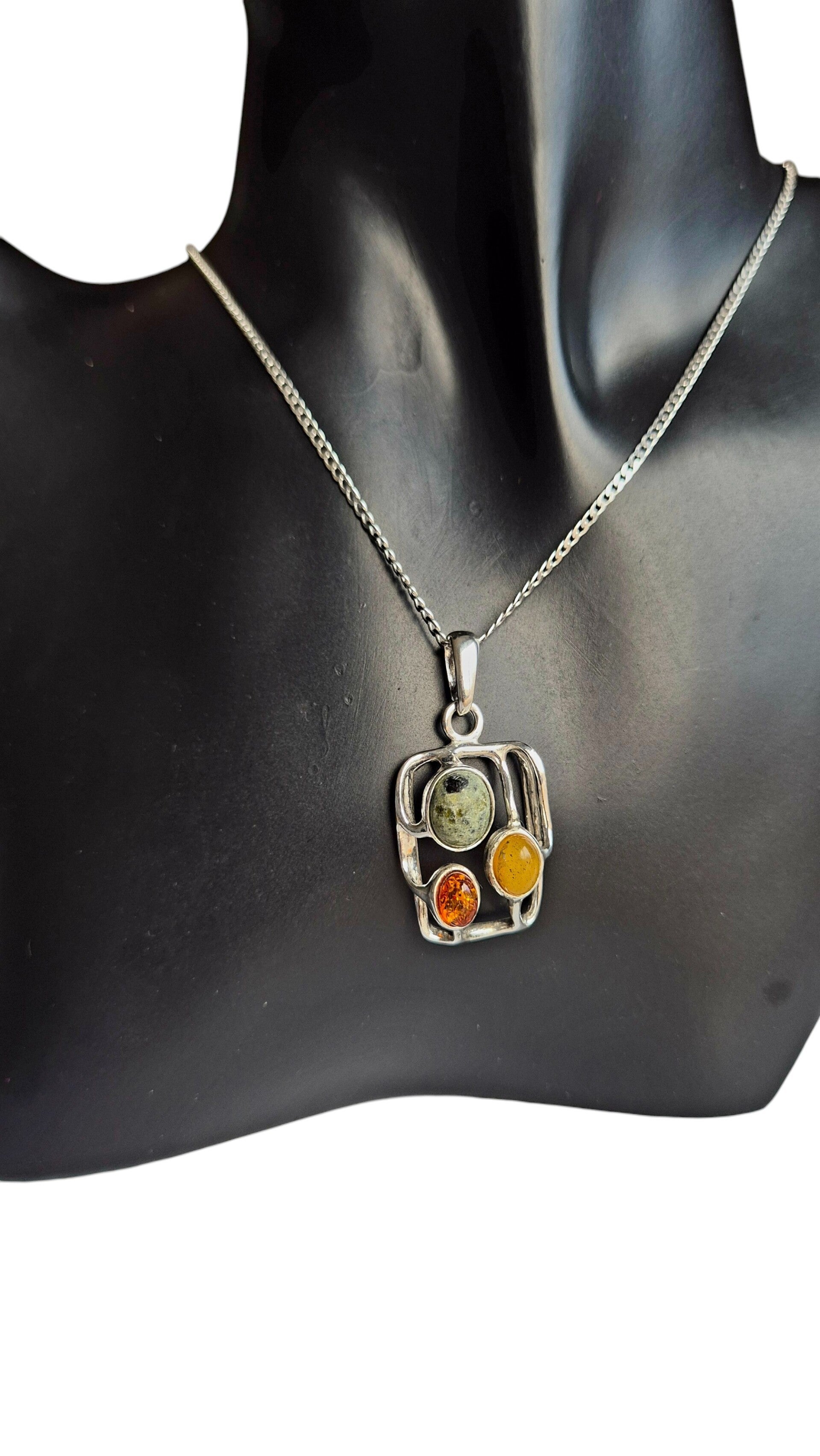 This sleek rectangular pendant brings together three natural stones – creamy white amber, deep cognac amber, and earthy green serpentine – set in polished 925 sterling silver. The combination of warm and grounding tones creates a calm, organic feel with a modern edge.